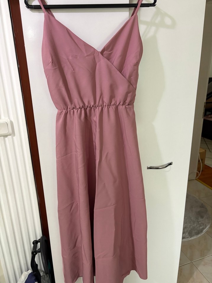 Pembe pastel renkte, ince askılı, V yakalı ve drapeli uzun, bol kesim elbisedir. Yumuşak sentetik kumaştan üretilmiştir.