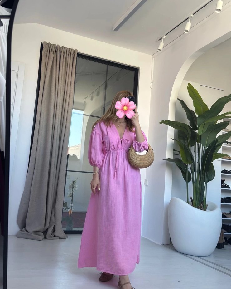 Pembe keten kumaştan, V yakalı, bol kesim ve drapeli detaylara sahip uzun elbise. 1 kez kullanılmıştır