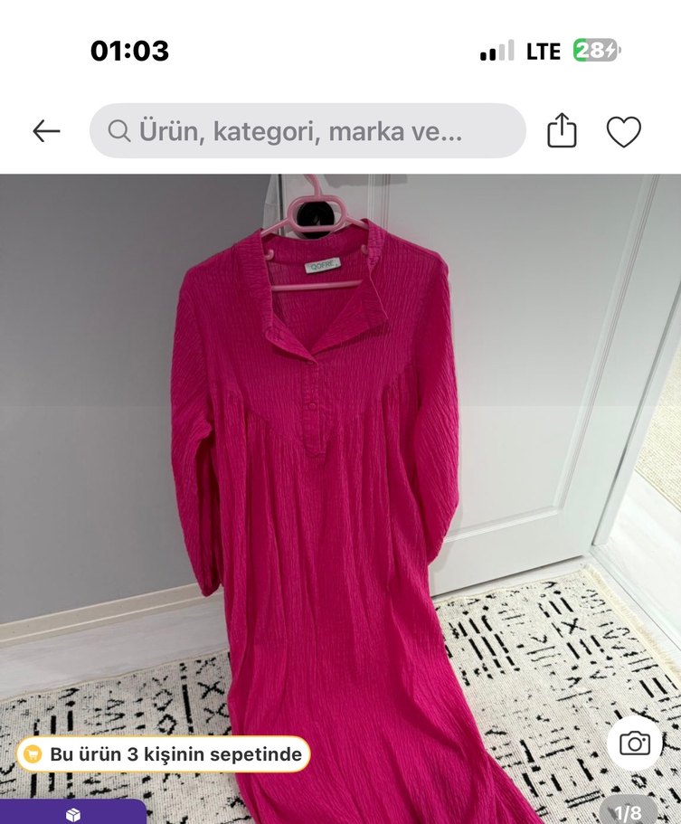 Pembe keten kumaştan, V yaka, düğmeli ve uzun kollu bol kesim elbise. Minimalist bohem tarzda, günlük kullanım için uygundur.