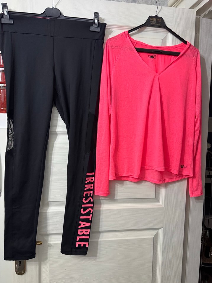 Pembe V yaka uzun kollu bluz ve siyah üzerinde "IRRESISTABLE" yazılı tayttan oluşan, rahat kesim aktif giyim takımı. Yumuşak sentetik kumaştan, spor ve günlük kullanıma uygun. Plates takımı ebru şallı koton özel koleksıyonu