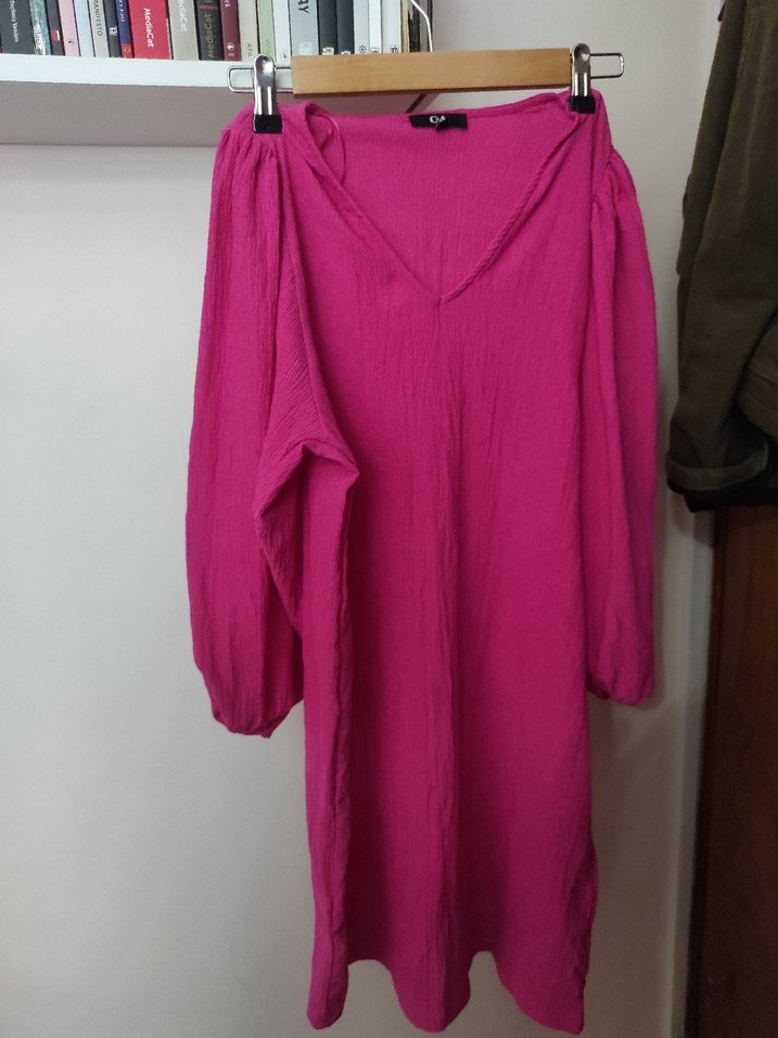 Düz bol kesim, v yaka elbise. C&A marka. Fuşya pembe günlük / yazlık elbise. Kesinlikle giyilmemiştir, giyeceğim diye etiketini kopardım küçük geldiği için satışta. Boyu çok kısa değil tam diz kapağı üstü gibi