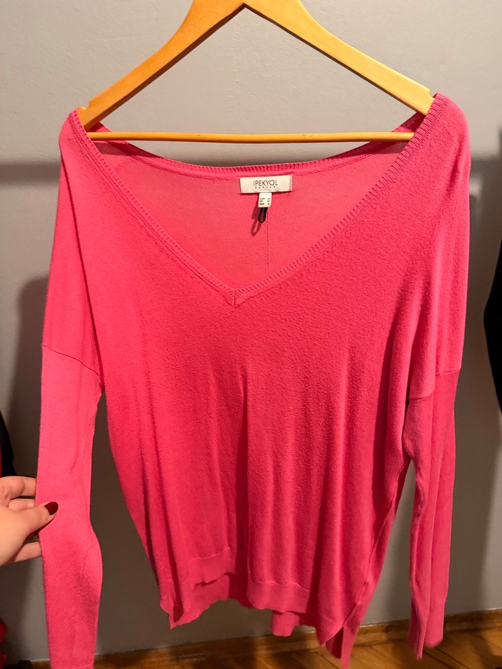 Pembe renkte, ipeksi dokulu ve örme kumaştan yapılmış, V yaka ve bol kesim uzun kollu kadın kazak. Günlük sokak stili için uygundur.