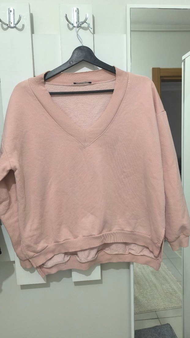 Pastel pembemsi renkte, V yaka ve uzun kollu, salaş kesimli bu sweatshirt, yumuşak sentetik kumaştan üretilmiş, günlük rahatlık ve zahmetsiz sokak stili sunar.