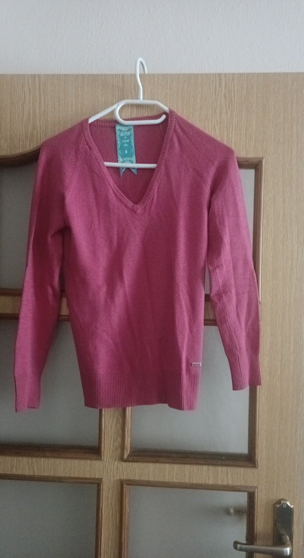 Pembe yün kazak, V yaka ve uzun kollu, bol kesim ve normal boyda. Örgü dokusu yumuşaklık sağlar, günlük sokak modasına uygun.