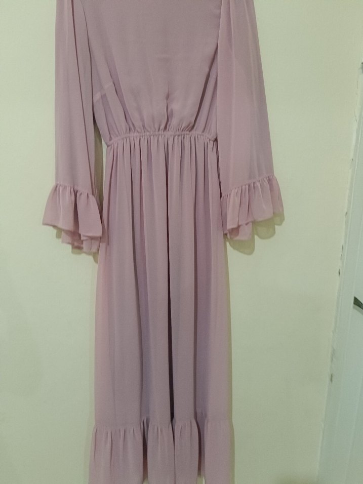 marka temsilidir.Pastel pembe renkte, V yakalı ve uzun kollu, kolları ve etek ucu volan detaylı uzun elbise. Bol kesim ve minimalist bohem tarzda, düğün için uygun.