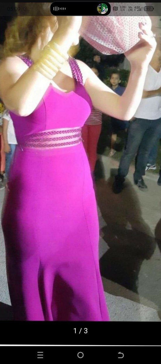 Pembe, V yakalı ve ince askılı abiye elbise, drapeli detaylarla parlayan ve modern tarzda, gösterişli bir düğün kıyafeti olarak tasarlanmıştır.