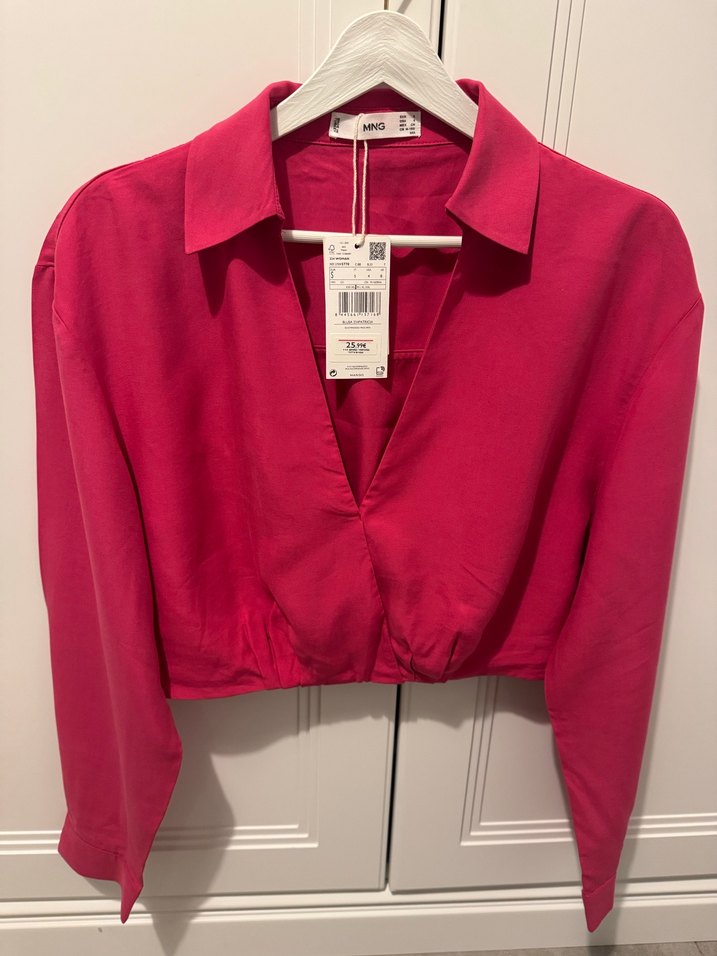 Pembe renk, uzun kollu, V yakalı, düğmeli keten gömlek. Parlak dokusu ve normal midi boyu ile romantik akşamlar için uygun.