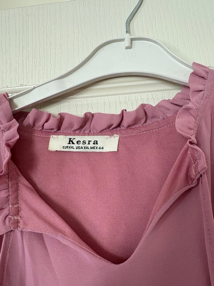 Pembe, kolsuz bluz, V yakalı ve fırfırlı detaylara sahiptir. Rahat kesimli, yumuşak sentetik kumaştan, bohem desenlidir. Marka: Kesra.