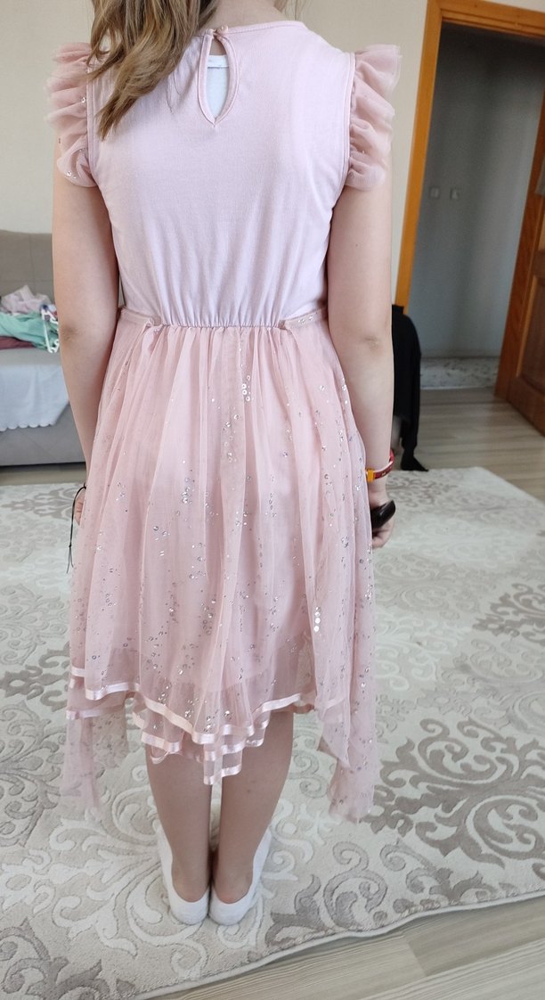 Pembe, bol kesim kız elbisesi; askılı, V yakalı ve fırfırlı detaylara sahip. Yumuşak sentetik kumaştan, pastel tonlardadır. ✨