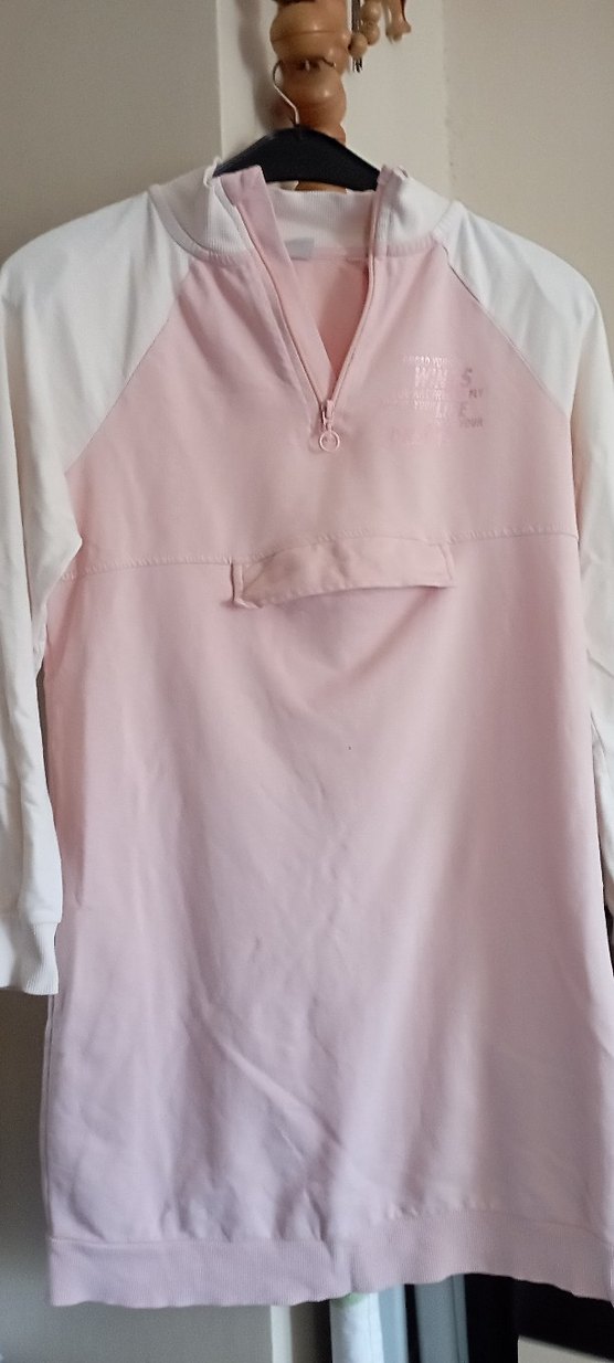 Pastel pembe renkte, kısa kollu ve V yakalı rahat kesim hamile tunik. Önünde fermuarlı detay ve midi boyda, yumuşak sentetik kumaştan üretilmiştir. Günlük sokak stiline uygun.