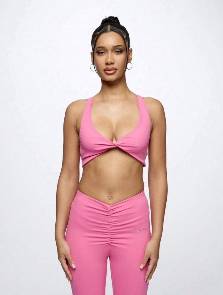 Pembe, V yakalı ve askılı kollu, vücuda oturan kadın spor üstü. Mini uzunlukta ve sentetik kumaştan, rahat ve şık bir tasarım sunar.