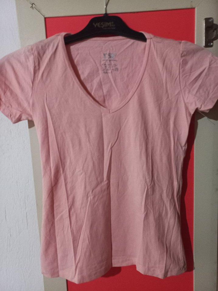 Pudra renk, pamuk kumaştan, V yakalı ve kısa kollu, rahat kesimli kadın tişörtü. Günlük kullanım için basic ve şık.