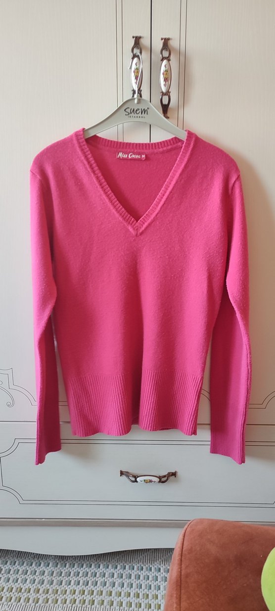 Pembe renkte, V yakalı ve uzun kollu kadın trikosudur. Yumuşak fleece kumaştan örülmüş olup, rahat kesimlidir ve günlük kullanıma uygundur.