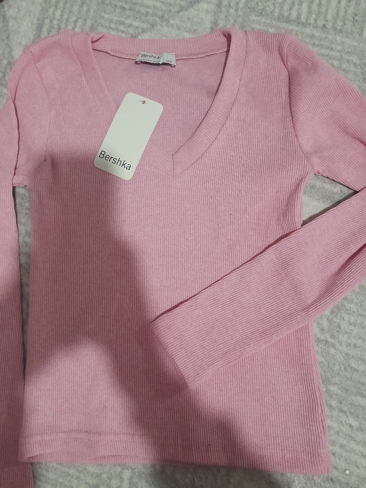 Bershka markalı, V yakalı, pembe uzun kollu, ince örgü kumaştan yapılmış kadın triko kazak. Rahat ve şık bir günlük kullanım parçası.
