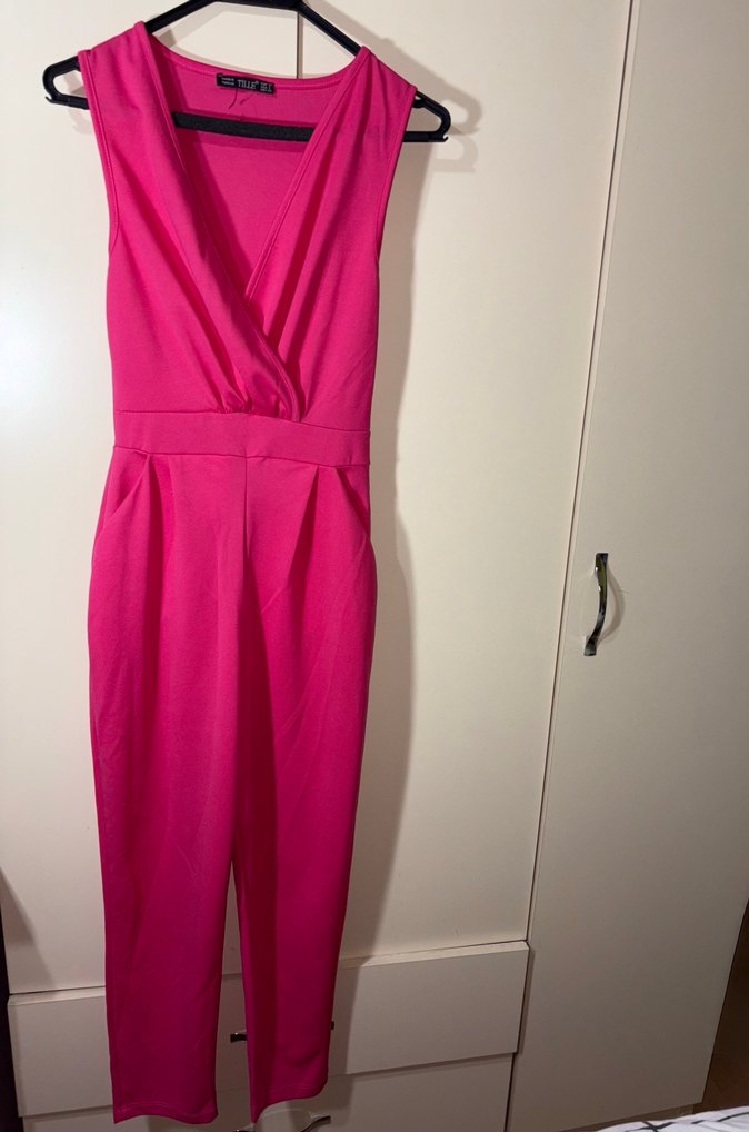 Pembe, V yakalı, kolsuz, drapeli kadın tulum. Sentetik kumaştan, midi boyda, ofis ve sokak stiline uygun.