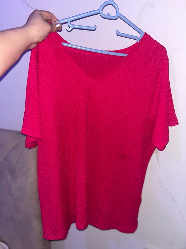 Pembe keten kumaştan, V yakalı ve kısa kollu, bol kesim kadın tişörtü. Salaş ve drapeli tasarımıyla günlük sokak stiline uygun, midi boyda.