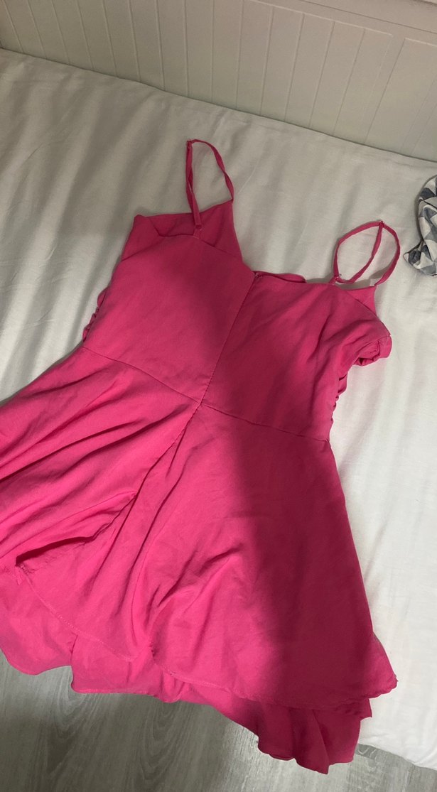Pembe renkli, keten kumaştan yapılmış, V yakalı ve askılı, fırfır detaylı dar kesim kadın tulumu. Midi boyda ve parlak görünümlü, romantik buluşmalar için uygun.
