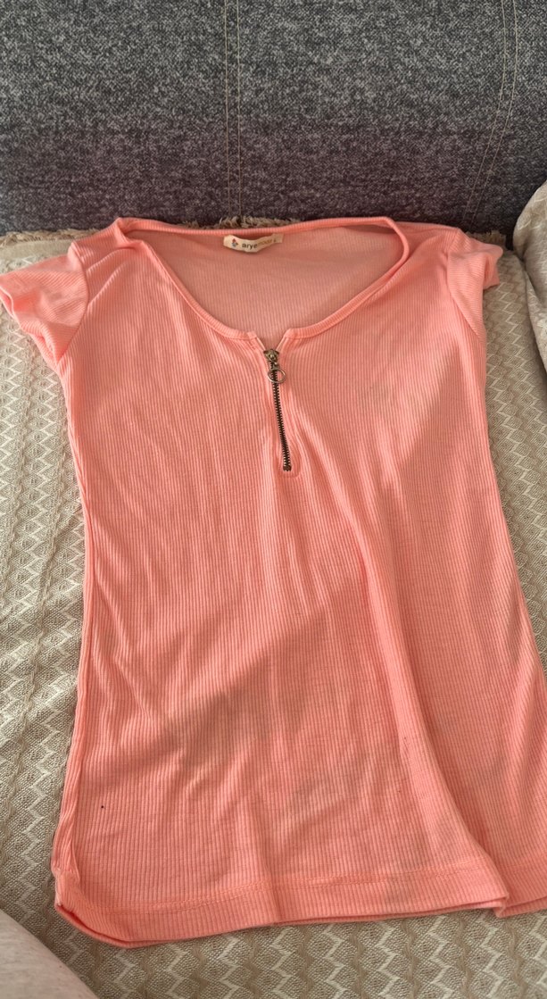 Pembe, kısa kollu, V yakalı ve önde fermuarlı bu dar kesim bluz, yumuşak sentetik kumaştan üretilmiştir. Günlük sokak stiline uygundur.