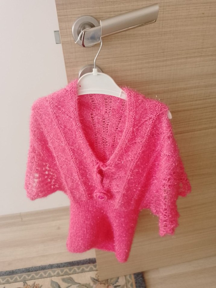 Renkli pembe, V yakalı, kolsuz ve bol kesim. Yumuşak örgüden üretilmiş, rahat ve bohem tarzda günlük kullanım için uygun. şal 4 5 yaş kız çocuk