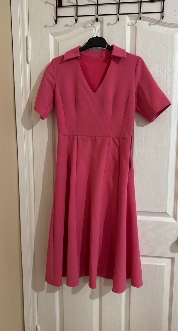 Pastel pembe midi elbise, V yakalı, kısa kollu ve regular fit. Drapeli tasarımı ve modern klasik stili ile ofis için uygun.
