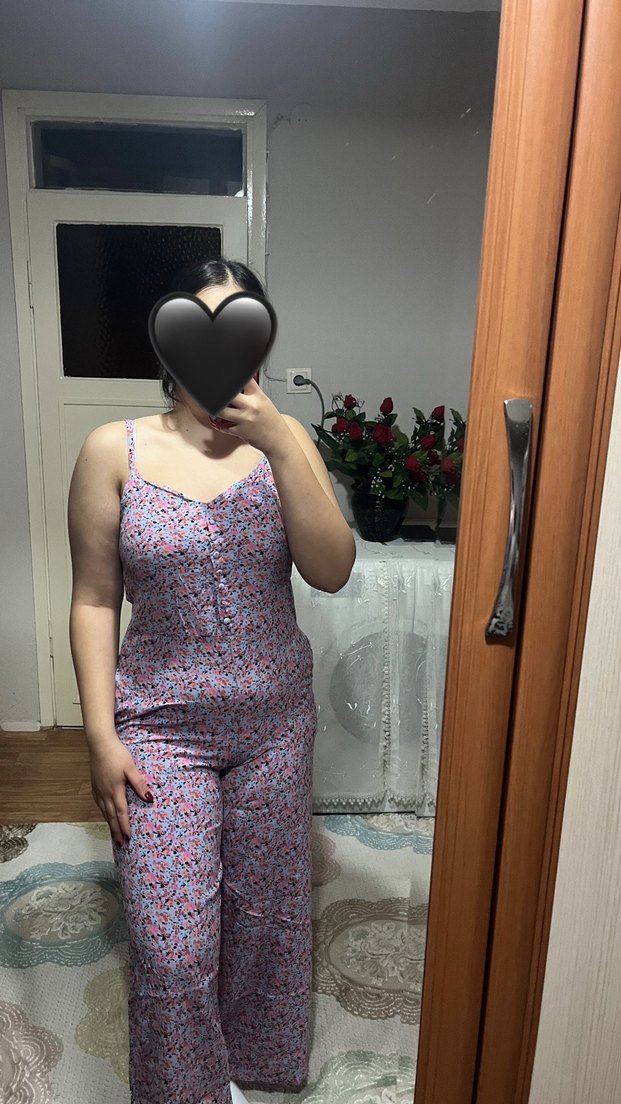 Pembe pastel tonlarında, V yakalı ve düğmeli, kolsuz, midi boy kadın tulumu. Günlük kullanıma uygun, sentetik kumaştan çiçek desenli tulum. Etiket kısmında yedek düğmesi bulunmaktadır