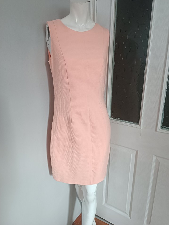 Pembe, kolsuz midi elbise, V yakalı ve fermuarlı sırt detayıyla. Normal kesim, çağdaş tarzda, ofis için uygun. boyu 91 koltukaltı 45 beli 38 bazen 43 astarlıdır