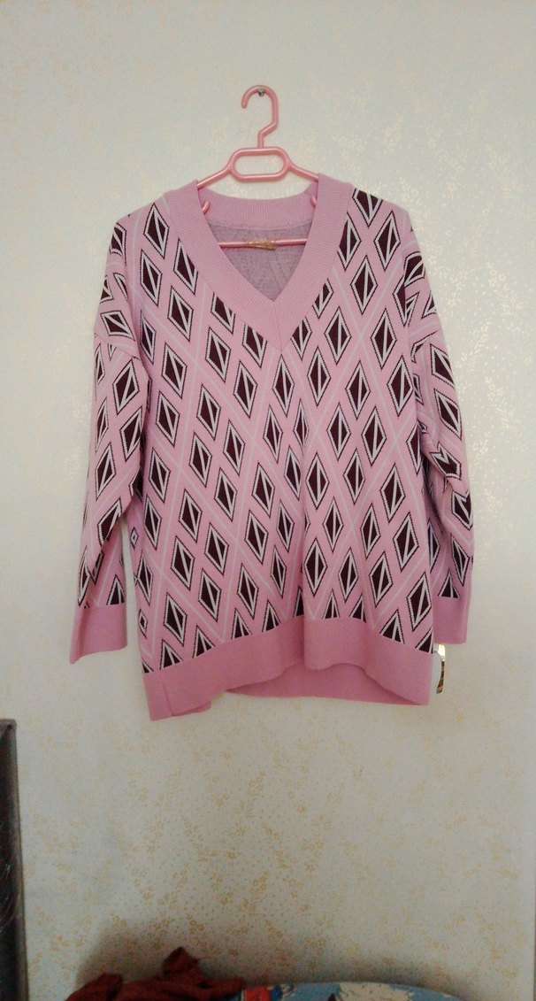 Pembe örgü kumaştan, V yakalı ve uzun kollu kadın kazak. Bol kesim ve normal boyda, bağlama desenli elmas detaylı, günlük sokak stili için uygun.