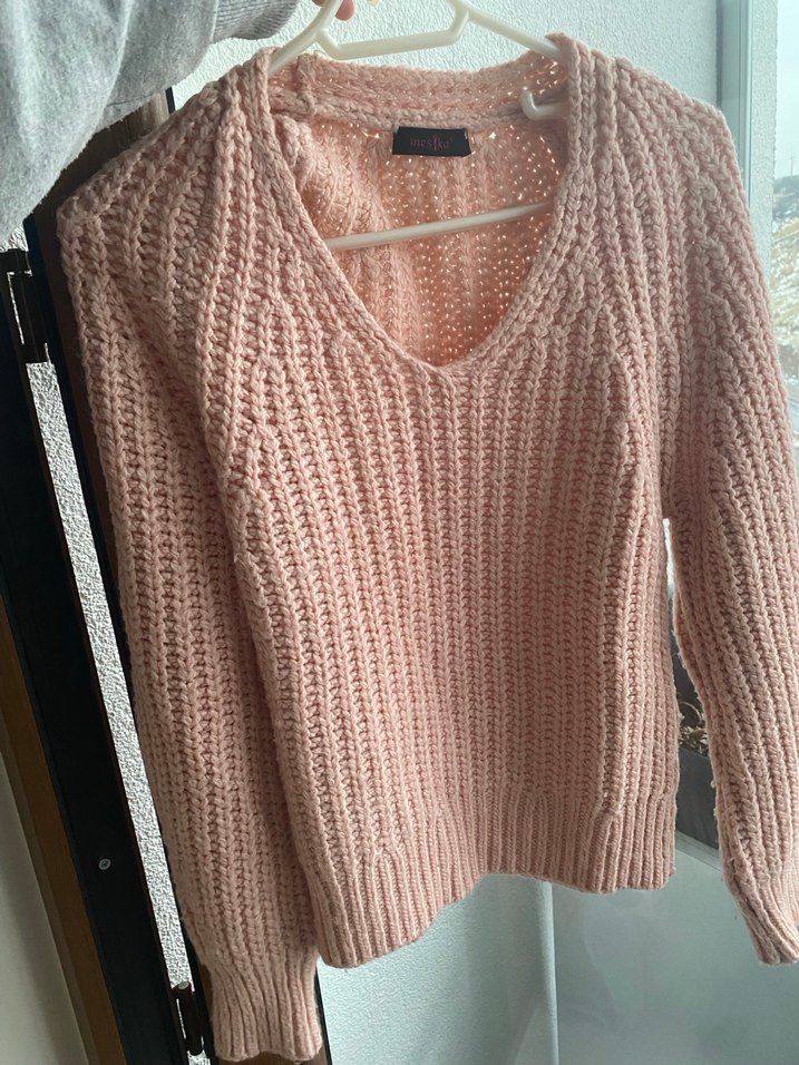 Pembe renkli, V yakalı ve uzun kollu örgü kadın kazak. Rahat kalıbı ve normal boyu ile günlük kullanıma uygun, yumuşak ve konforlu bir parça.
