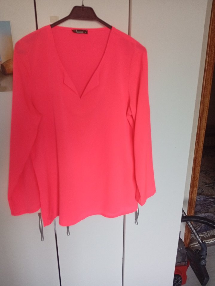 Pembe, V yakalı, uzun kollu, salaş kesim, parlak sentetik kumaştan yapılmış midi uzunluğunda drapeli bluz. Günlük kullanım için uygundur.