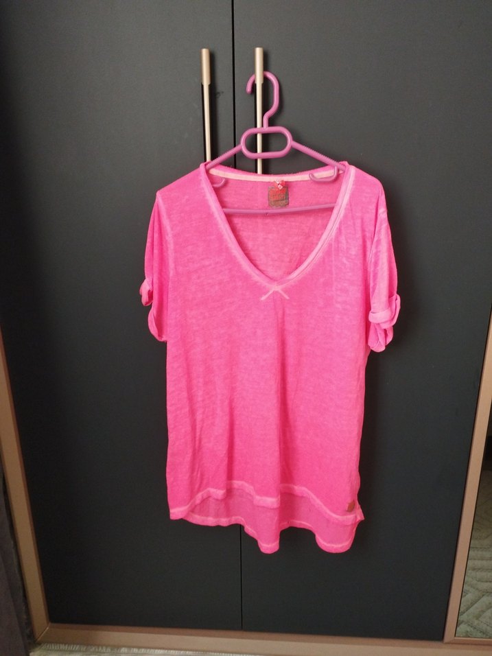 Yumuşak keten kumaştan, salaş kesim, pembe V yakalı kısa kollu gömlek. Canlı batik desenli, günlük sokak tarzına uygun.