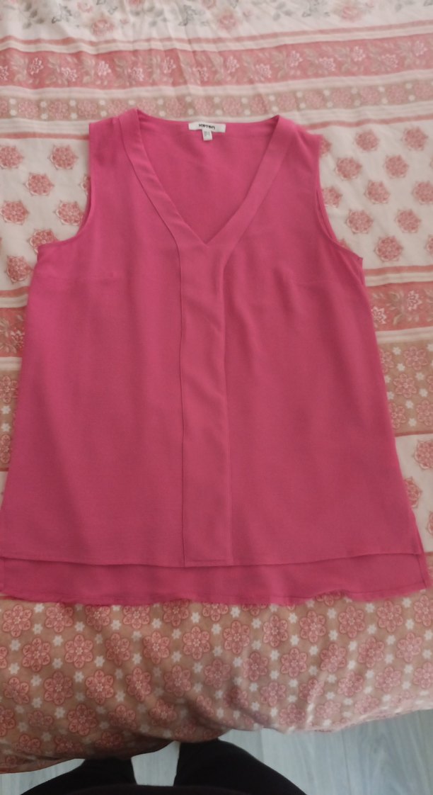 Pembe renkte, V yakalı ve salaş kesim kolsuz bluz. Yumuşak sentetik kumaştan, drapeli detaylı ve normal midi boyda, günlük kullanıma uygun.