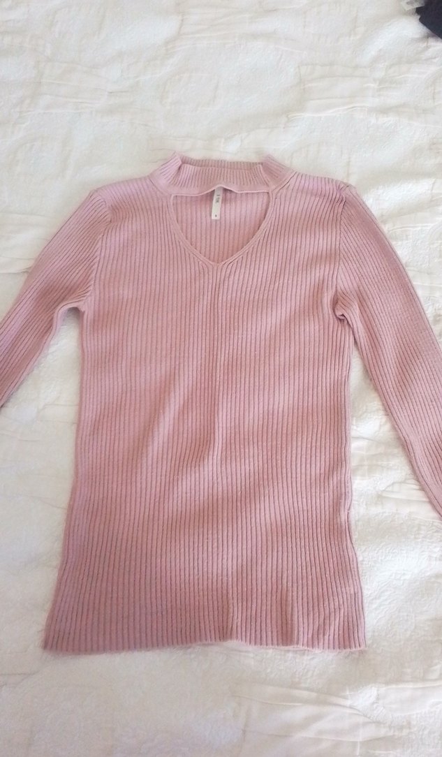 Pembe, V yakalı, uzun kollu, triko kumaştan yapılmış, rahat ve normcore tarzda, günlük kullanıma uygun, ince ve vücuda oturan kadın kazak.