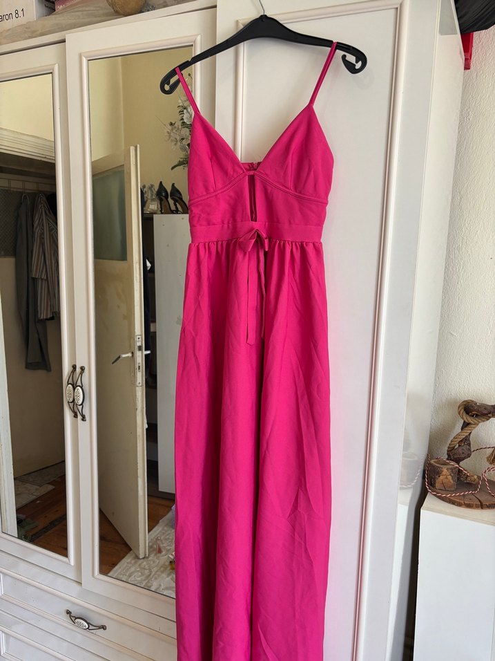 İnce askılı, V yakalı ve salaş kesimli uzun pembe elbise. Keten kumaştan, parlak dokunuşlu, romantik buluşmalar için uygun.
