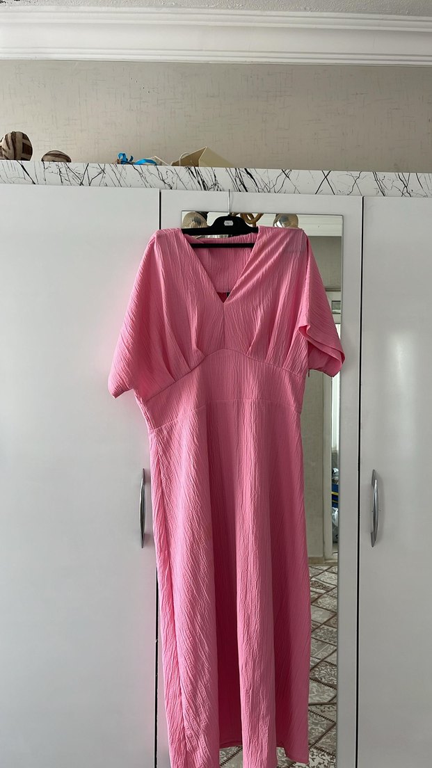 Pembe pastel renkte, keten kumaştan, V yakalı ve kısa kollu uzun, bol kesim drapeli elbise. Günlük kullanıma uygun.