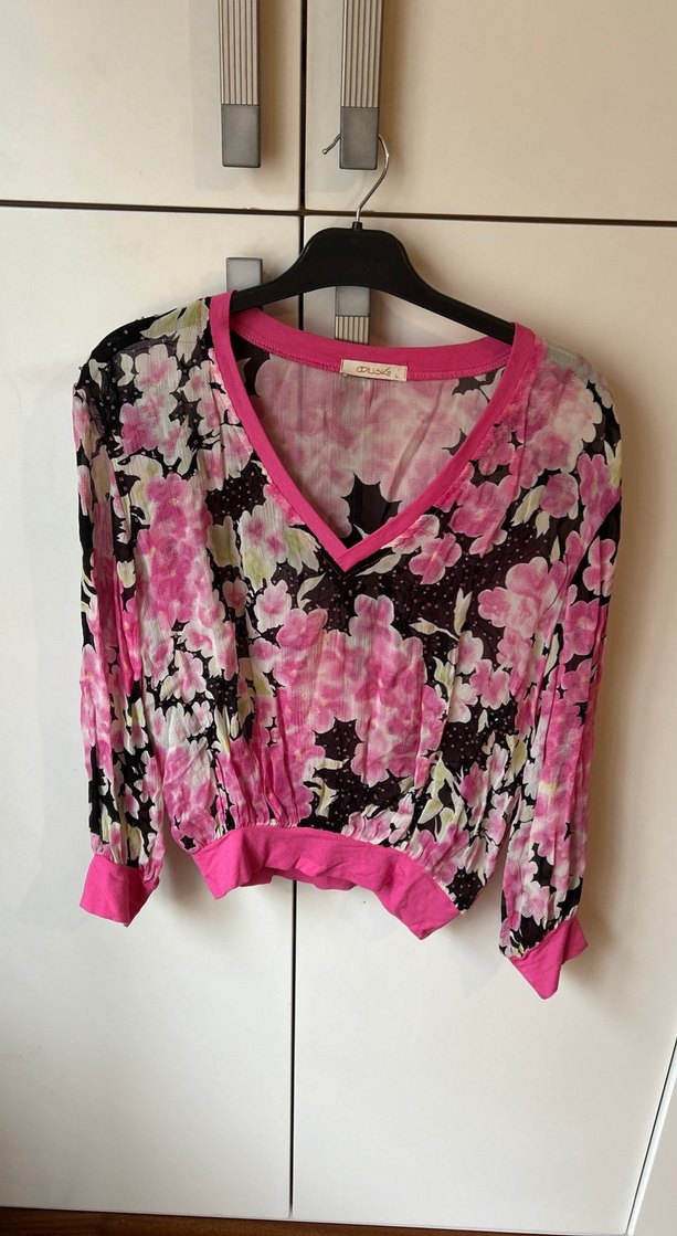 Kadınlar için uzun kollu, V yakalı, bol kesim pembe çiçek desenli, dantelli kısa bluz. Sentetik kumaştan yapılmıştır, günlük kullanıma uygundur.