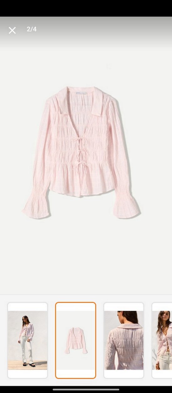 Pembe renkte, uzun kollu ve fırfırlı detaylı, V yakalı, rahat kesimli keten kumaştan yapılmış, bağlama detaylı ve batik desenli kadın bluz.%99 pamuk