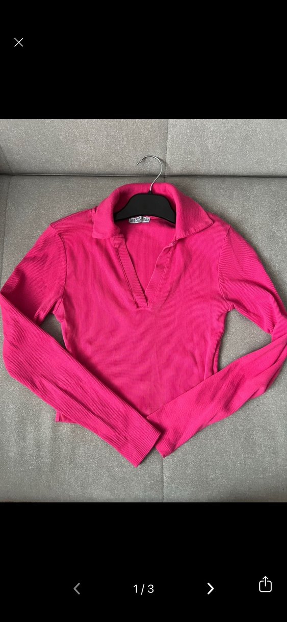 Pembe renkte, V yakalı ve uzun kollu, yumuşak sentetik kumaştan, düğmeli detaylı, normal boyda, dar kesim kadın kazak.