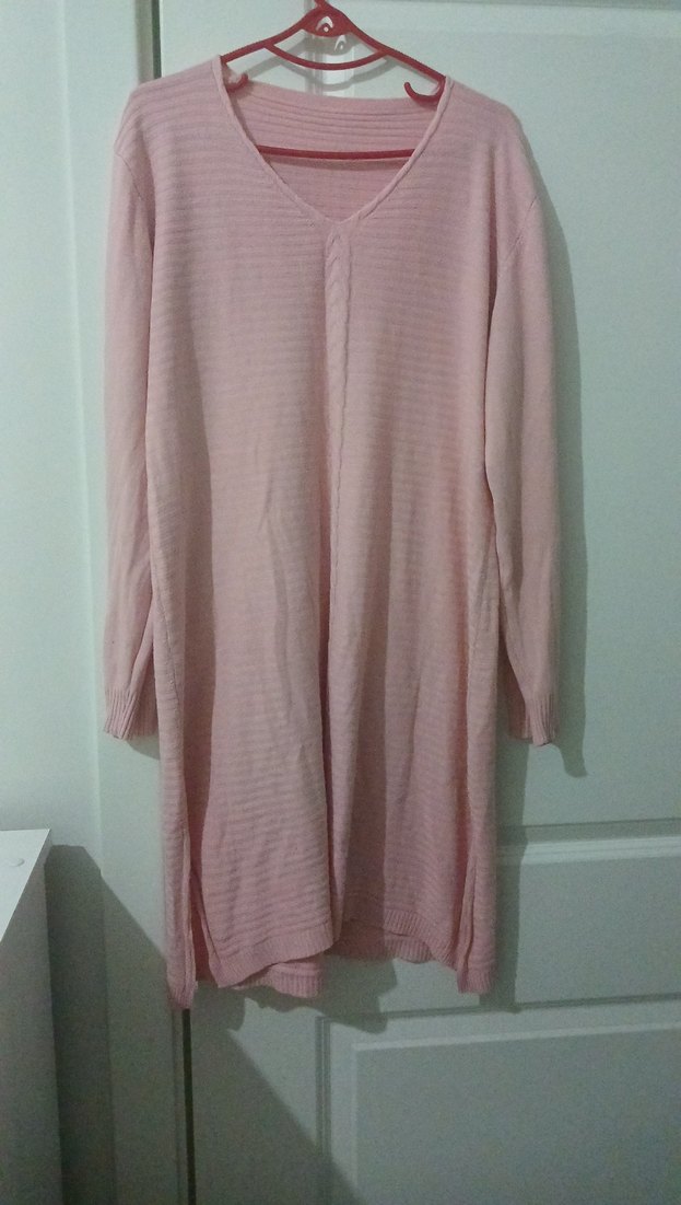 Pembe keten kumaştan, uzun kollu ve salaş kesim kadın kazak. V yaka ve pileli detaylara sahip, günlük kullanıma uygun rahat bir model.