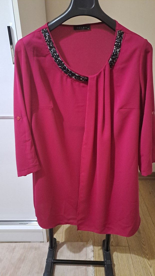 Pullu V yakalı, parlak pembe renkte, uzun kollu ve salaş kesimli, drapeli bluz. Ofis kullanımı için uygundur.