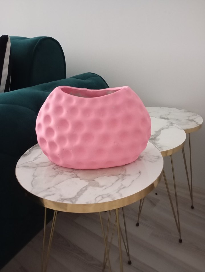 Yumuşak dalgalı dokulu yüzeye sahip pastel pembe renkte yuvarlak vazo. Dekorasyona hoş bir dokunuş katıyor.
