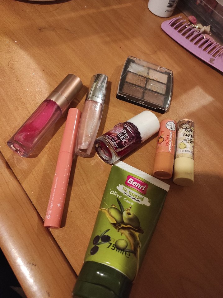 Canlı pembe lip gloss, açık şeftali dudak balmı, doğal tonlarda küçük far paleti, nemlendirici zeytin özlü el kremi ve parlak dudak ürünü içerir.