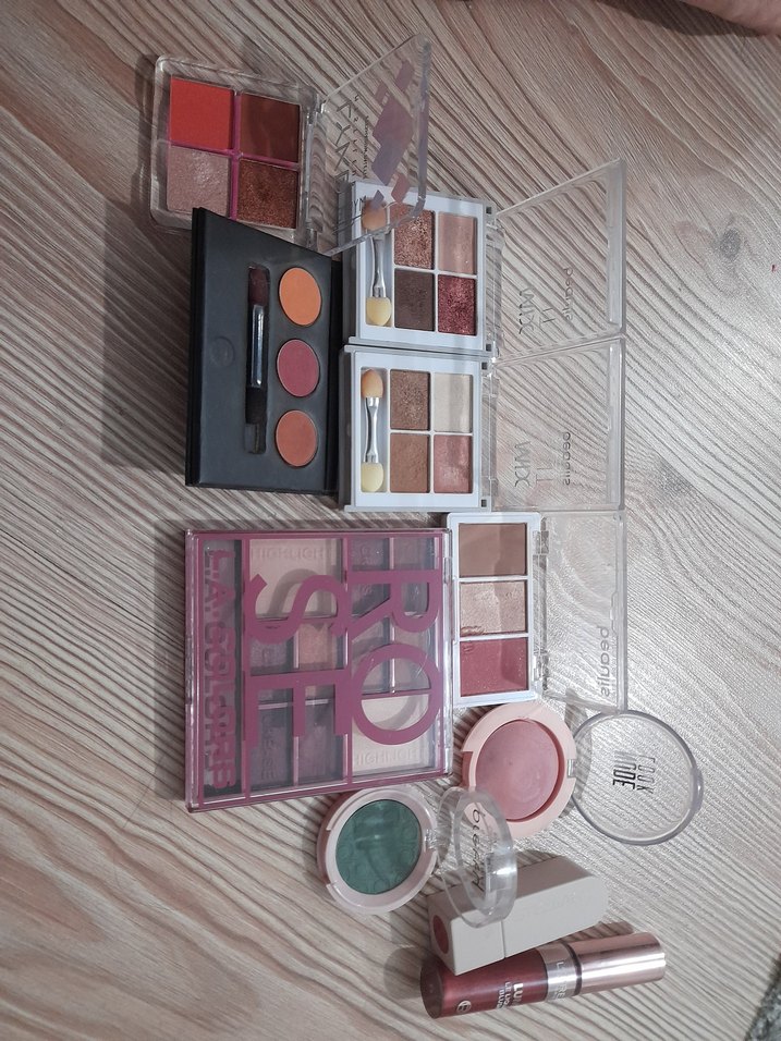 Açık ve pembe tonlarda, çeşitli göz farı, allık ve ruj içeren makyaj paletleri seti. Yumuşak ve renkli makyajlar için uygundur.