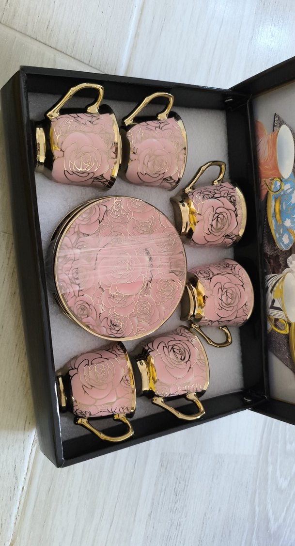 Altın detaylı, çiçek desenli koyu pembe 6 kahve fincanı ve tabakları set halinde sunulmaktadır. ☕