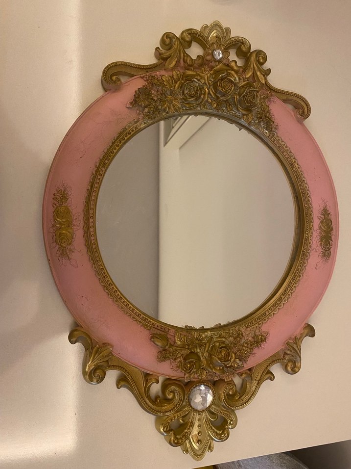 Parlak pembe çerçeve ve detaylı altın çiçek süslemeleriyle dekoratif yuvarlak ayna. Tepsi olarak da kullanılabilir