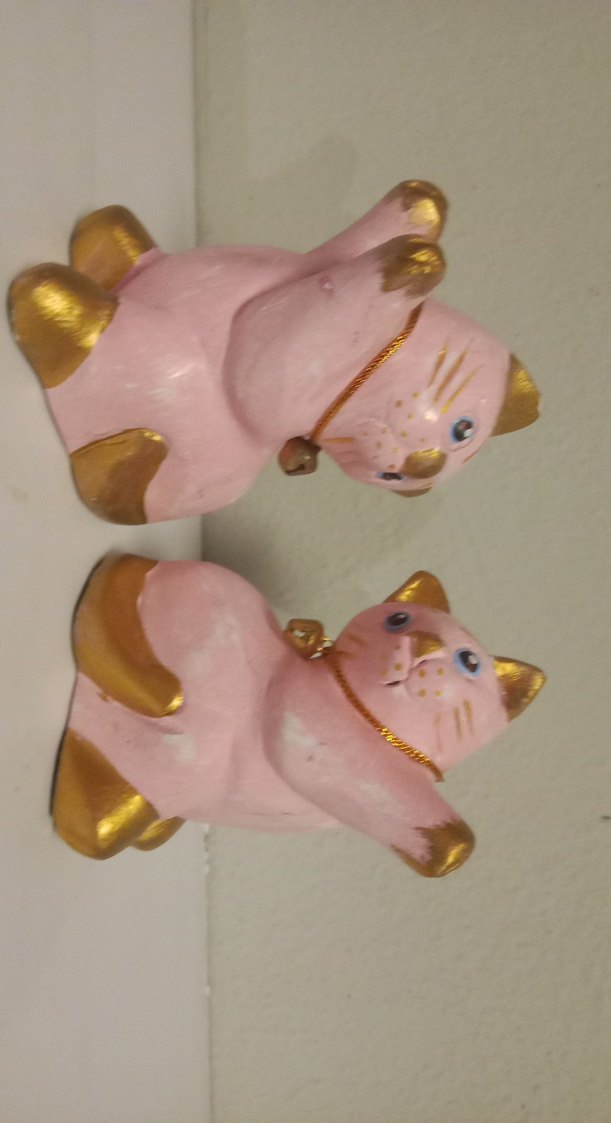 İki pastel pembe kedi biblodan oluşan set, kulak, pati ve kuyruklarında altın detaylar bulunur. Her kedinin boynunda küçük altın ipli zil vardır.