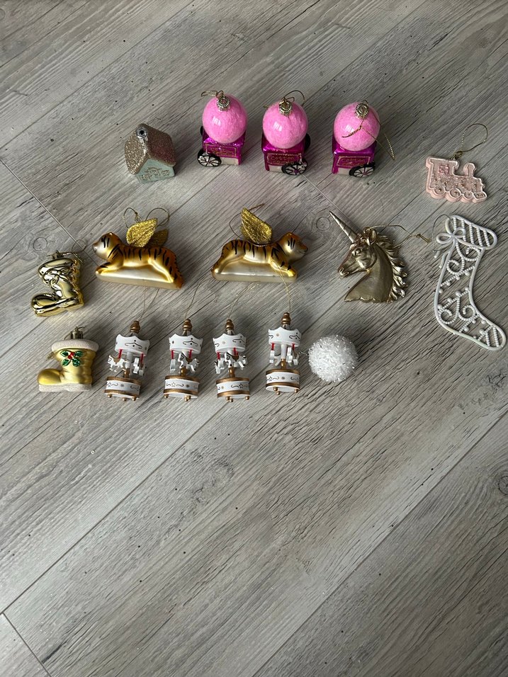 Pembe ve altın tonlarında, unicorn, asker figürleri ve çeşitli yeni yıl süslerinden oluşan set.
