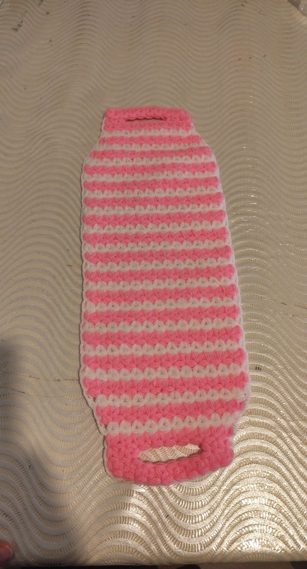 Pembe ve beyaz çizgili, iki ucunda tutma sapları bulunan banyo süngeri.