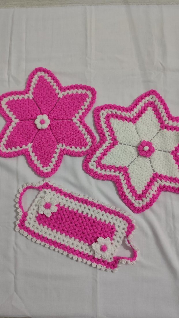 Pembe ve beyaz çiçek desenli el örgüsü lifler yıldız ve dikdörtgen şekillerde. Yumuşak iplikle geleneksel tarzda hazırlanmıştır.