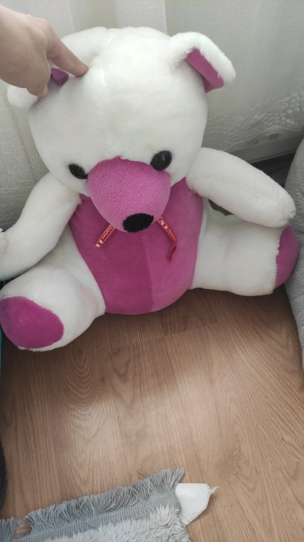Pastel pembe ve beyaz renklerde, büyük burunlu ve boynunda kurdele bulunan yumuşak peluş oyuncak ayı.