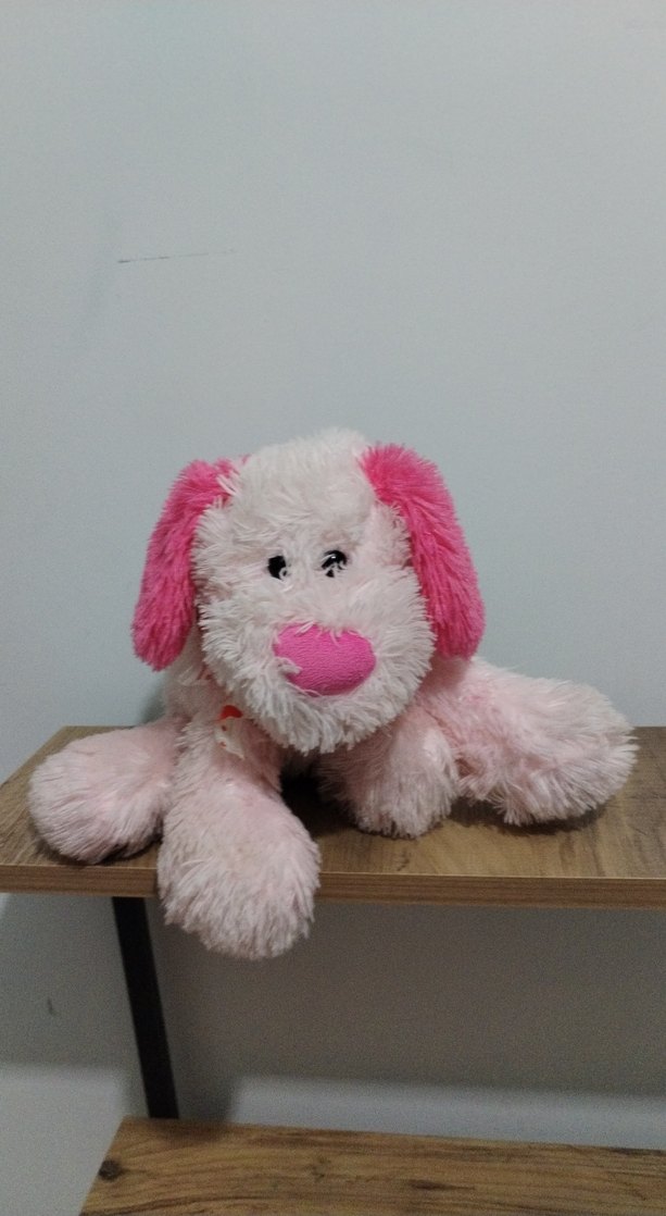 Yumuşak peluş, pembe ve beyaz renkte, sarkık kulaklı ve büyük burunlu oyuncak köpek.